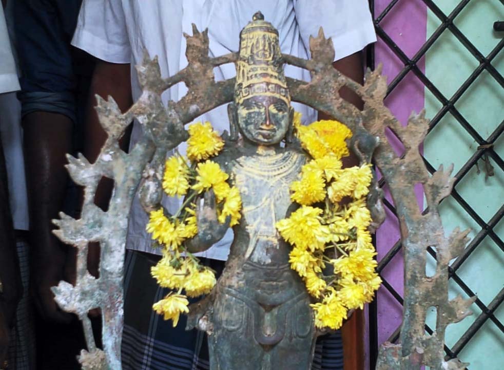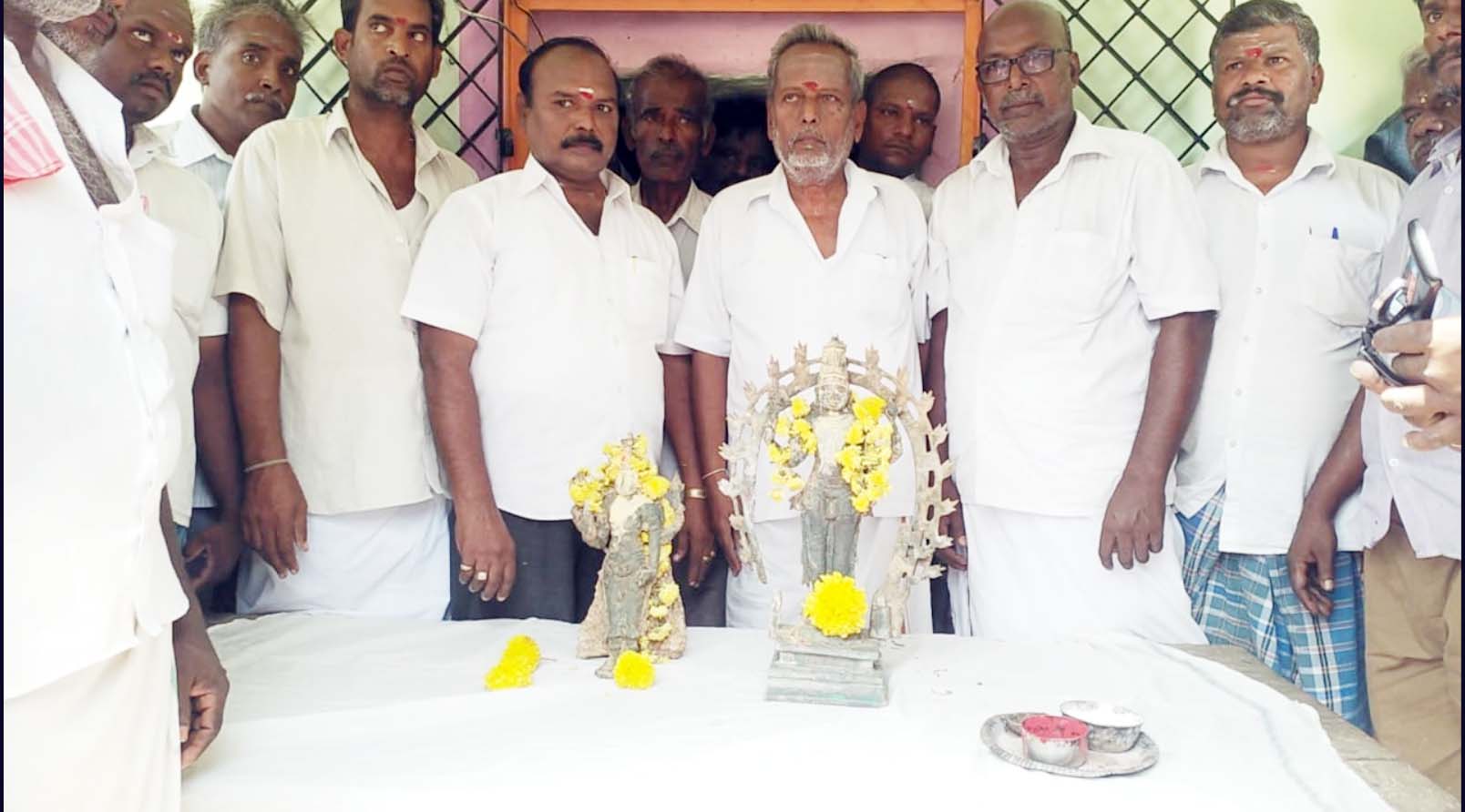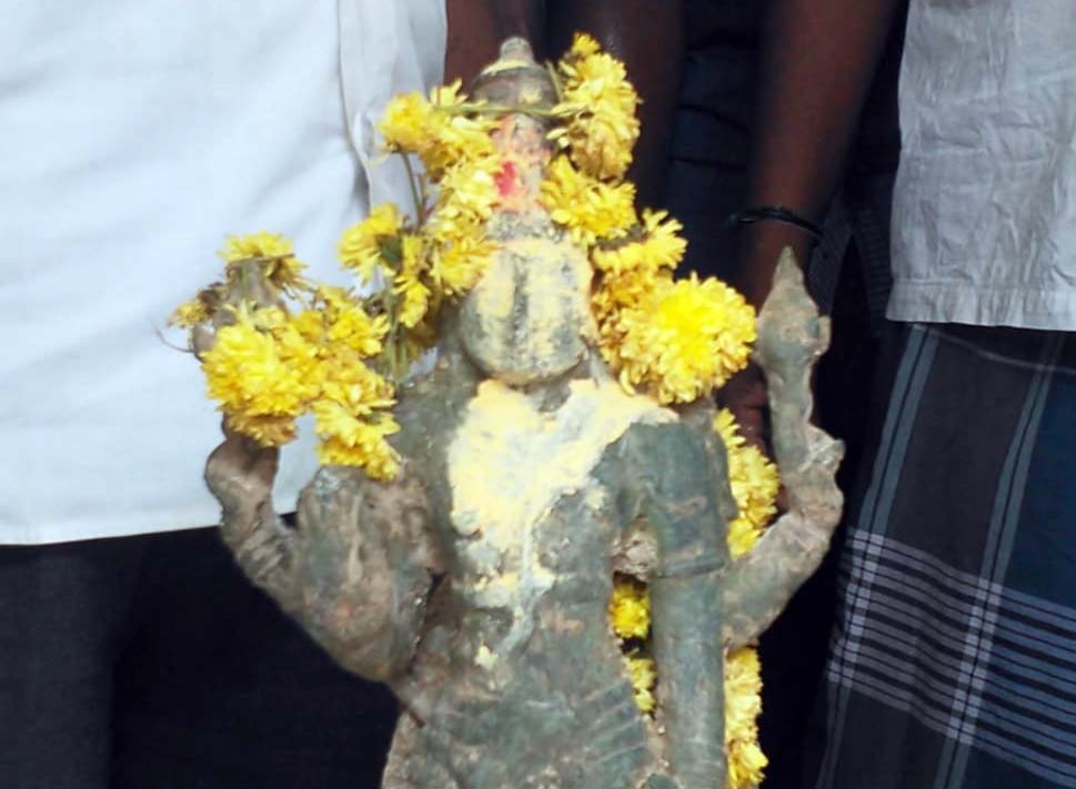 புதையலாக அது இருக்கக் கூடும் என்ற எண்ணத்தில் சத்தம் வந்த அந்த இடத்தினை மிகக் கவனமாகத் தோண்டியுள்ளனர். நிலத்தினுள் புதைந்திருந்த சுமார் 1 1/2 அடி உயரம் 3 கிலோ ஒரு பெருமாள் சிலையும், சுமார் 1அடி உயரம் 2கிலோ எடையுள்ள ஆழ்வார் சிலை ஆகிய இரு வெண்கலச் சிலைகள் கண்டெடுக்கப்பட்டன.