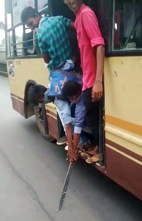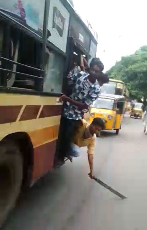 சென்னையில் இன்று அரசுப் பேருந்தில் சில கல்லூரி மாணவர்கள் படியில் நின்றபடி பட்டாக் கத்திகளைத் தரையில் தேய்த்துத் தீப்பொறி பறக்கவிட்டு அட்டகாசம் செய்து பயணித்தனர். மாணவர்களின் இந்த அடாவடியால் பேருந்தில் பயணித்தவர்கள், சாலையில் சென்றவர்கள் என அனைவரும் அடுத்து என்ன நடக்குமோ என்ற அச்சத்தில் உறைந்து செய்வதறியாது தவித்தனர்.